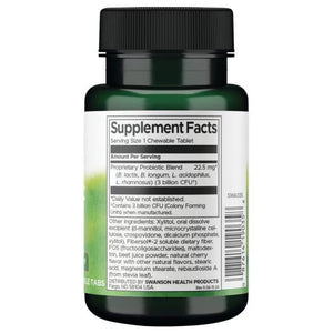 Swanson Probiotic for Kids satur 3 miljardus CFU vienā tabletē. Patentētais maisījums ietver 4 celmus: Lactobacillus acidophilus un Lactobacillus rhamnosus, divus celmus, kas palīdz sadalīt barības vielas, ražojot pienskābi un laktāzi; un Bifidobacterium lactis un Bifidobacterium longum, divi citi pienskābi producējoši celmi, kas kopā darbojas, lai atbalstītu gremošanas un imūnsistēmas veselību. Šīm košļājamajām tabletēm bez cukura ir dabīga ķiršu garša, kas padara tās par ideālu probiotiku bērniem.